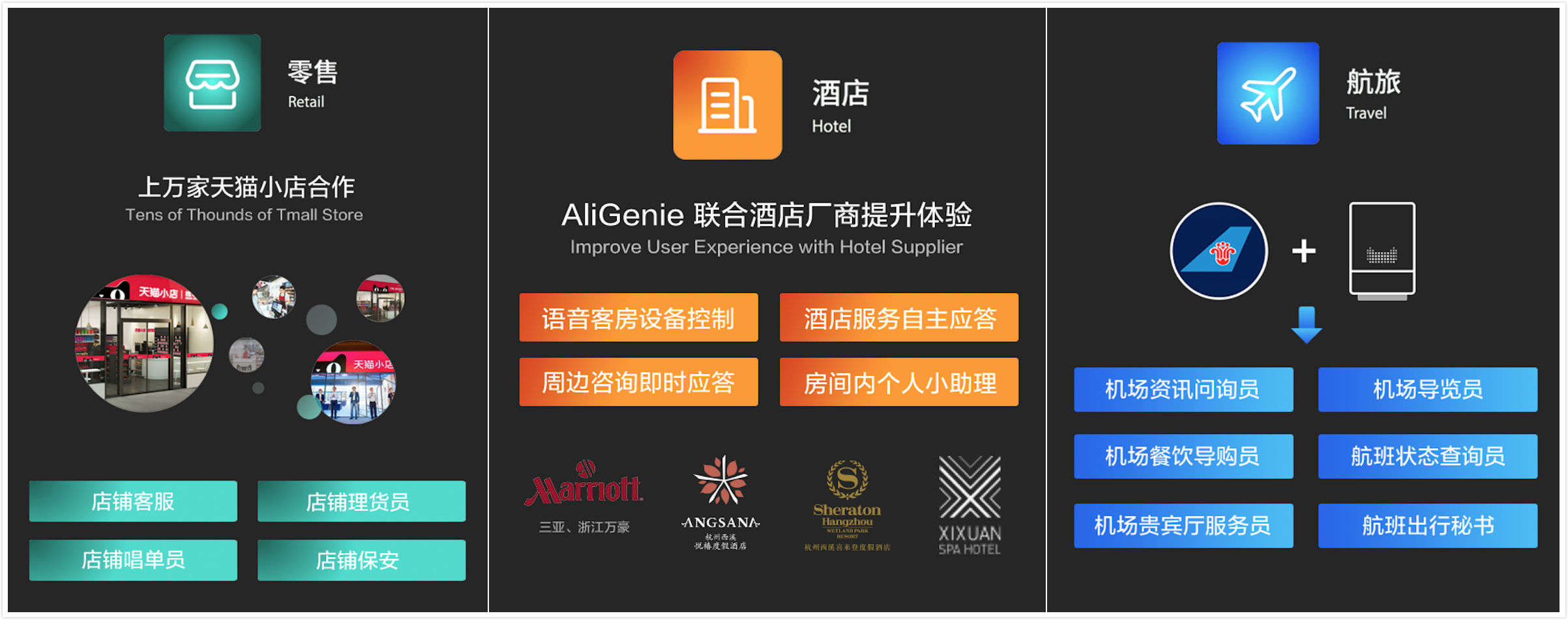而线下场景从来都是阿里不会放过的地方,所以对于线下零售、航空候机、酒店客房等应用场景,AliGenie 开放平台同样推出了垂直行业解决方案。