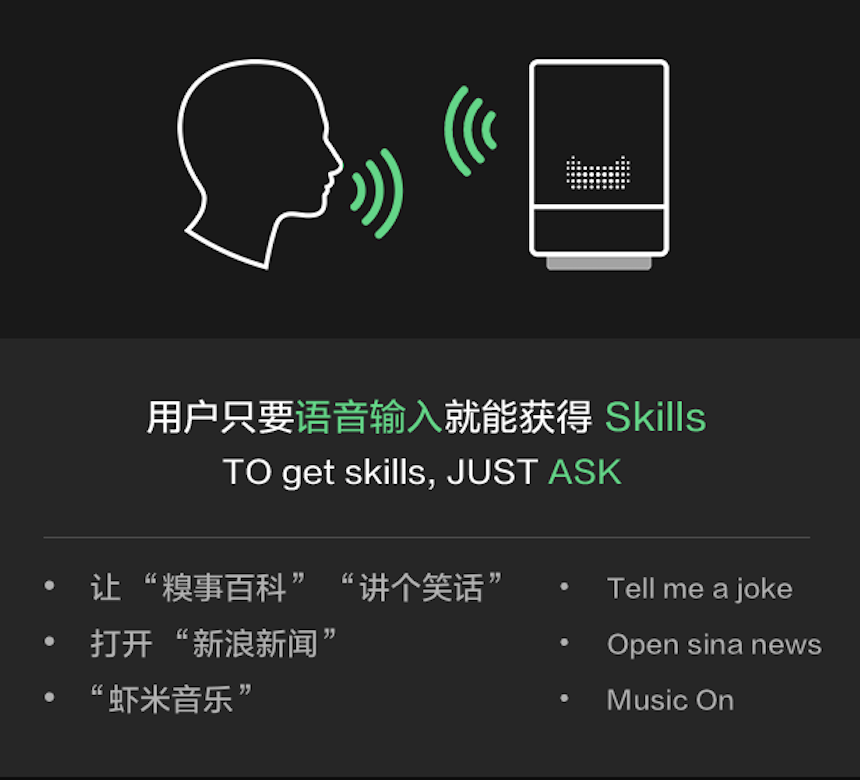 重要的是,未来的用户不需要下载和更新语音 APP 市场,只需要语音输入就能获得这些 Skills。并且这种 Skill 不需要下载,用户只需要语音输入就能获得 Skills,比如用户可以直接对天猫精灵说:让「糗事百科」讲个笑话、打开「新浪新闻」、打开「虾米音乐」……等指令就能直接唤醒相应的 Skill。