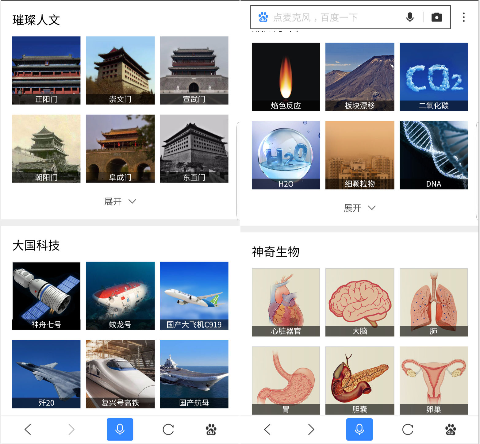 目前用户在手机百度 XR 项目收录的公共词条中,已经涵盖了展示北京各大城门楼的「璀璨人文」、展示国内交通运输工程的「大国科技」、展示宇宙景观的「地球奥秘」、普及化学知识的「炫酷科学」和详解人体各大器官组织的「神奇生物」,一共 5 个大的板块,其中都优先收录了一些基础词条。
