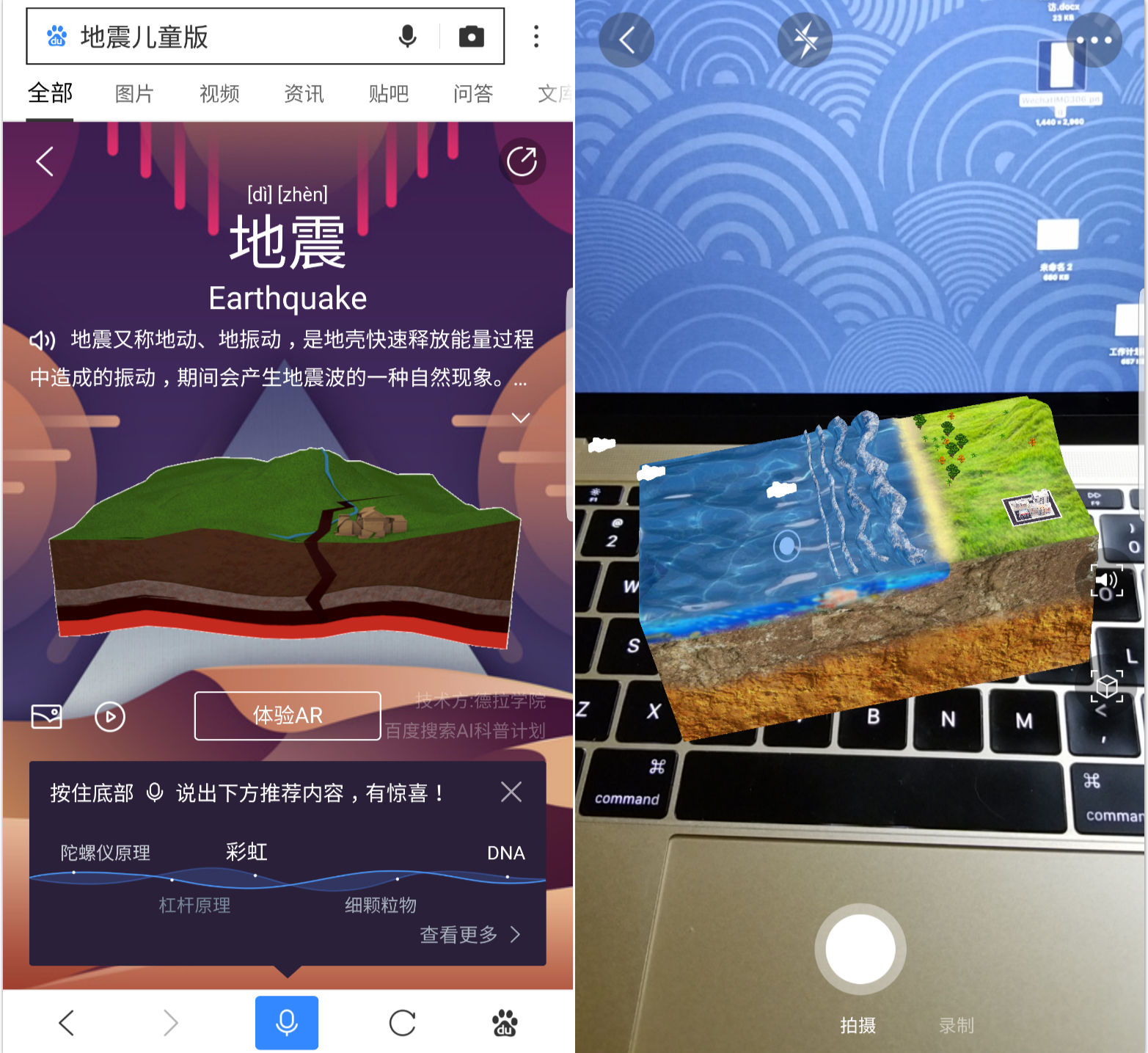 现在,当你使用最新版本的手机百度搜索某系像是「地震」这样特殊词条时,就会看到这个词条针对 XR 专门做的优化。不再是传统的文字配上简单的图片或视频,而是用 3D 图像的方式更生动的展示地震的过程和原理,同时还会有对应的语音解说。