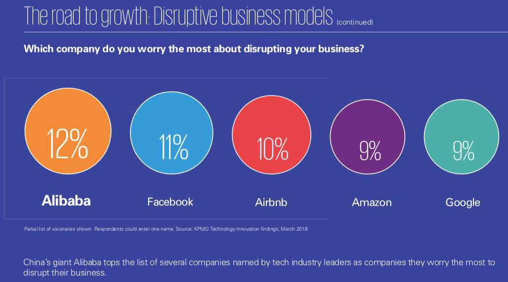 在最新出炉的毕马威年度创新报告中,阿里巴巴成为了该报告有史以来第一家上榜的中国公司,并且一上榜就拔得头筹,力压硅谷,成为了地球上最有科技颠覆力的公司。
