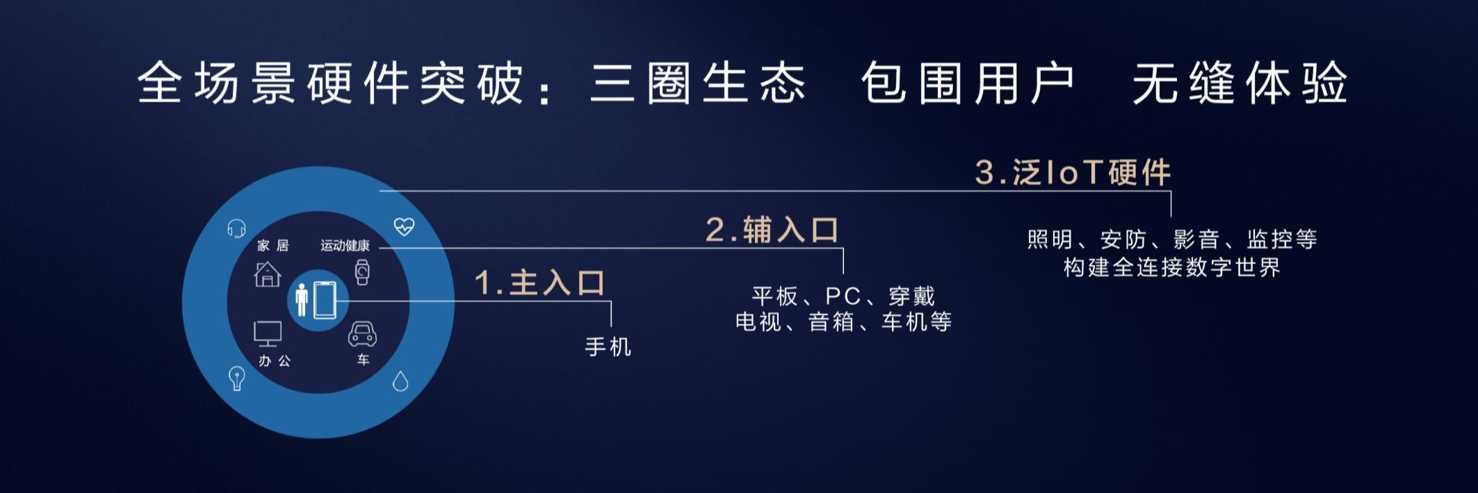 他提到,围绕全场景的智慧生活生态战略,华为将以手机为主入口,平板、PC、穿戴设备、电视等作为辅入口,联合包括照明、影音、监控在内的泛 IoT 硬件这三个生态圈,来构建一个全连接的数字世界。
