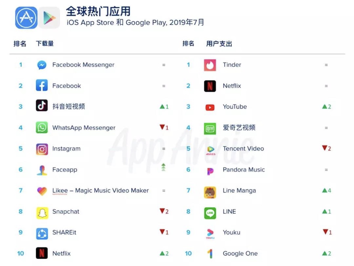 近日,全球移动应用数据平台App Annie发布2019年7月热门应用排名。数据显示,在线视频平台在用户支出TOP10中占据五席,Netflix、Youtube跻身前三甲,爱奇艺APP位列第四、也成为排名最高的中国移动应用。
