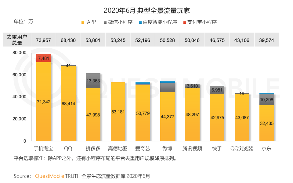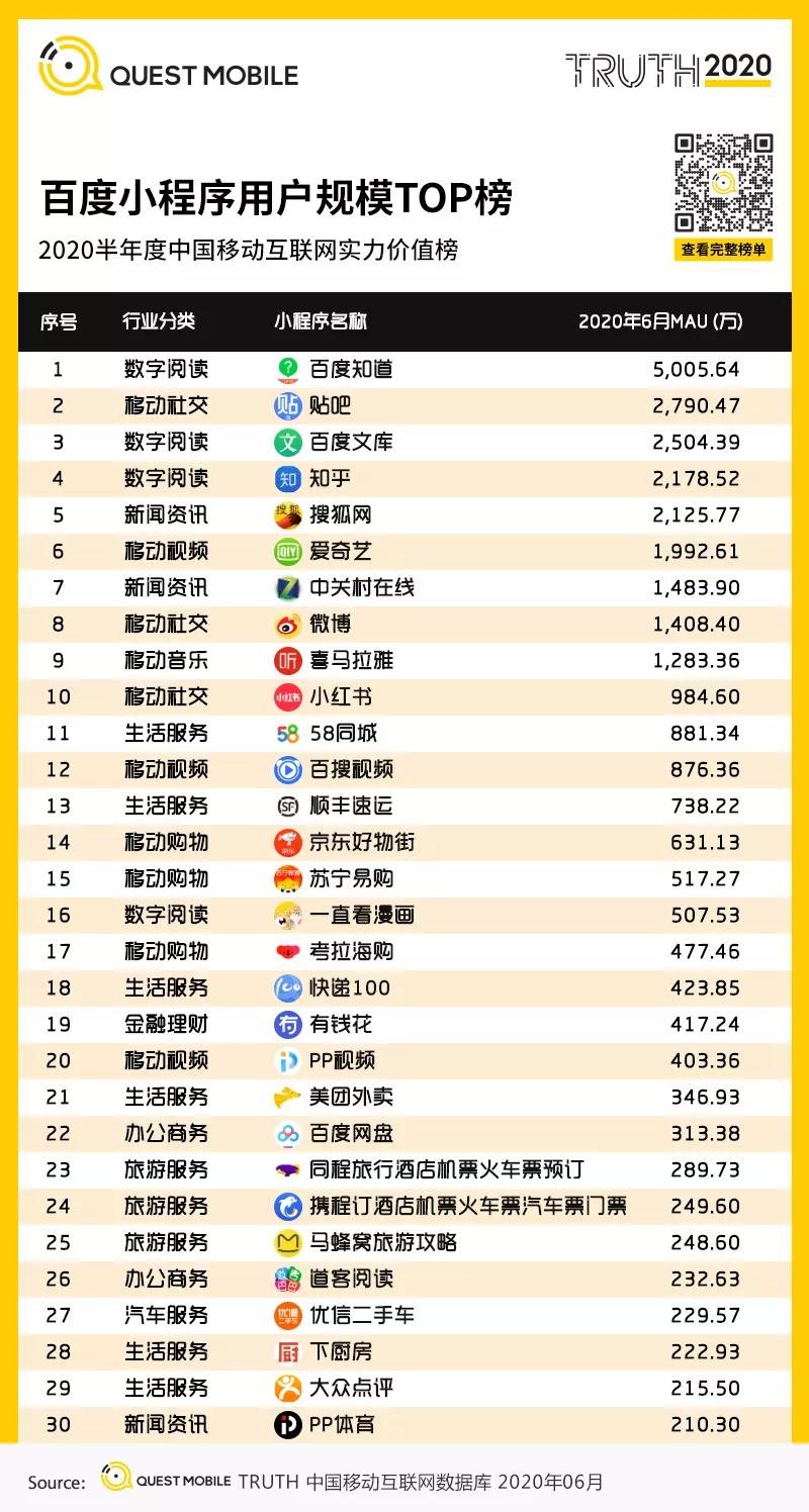 7月28日上午,QuestMobile发布的《中国移动互联网2020半年大报告》显示,小程序已经成了众多APP流量重要入口、新增用户的来源。百度的搜索、信息流优势对爱奇艺、微博、京东等平台的用户增长都有显著的推动,为众多内容型小程序提供了流量支持,目前百度智能小程序头部应用月活超过5000万。