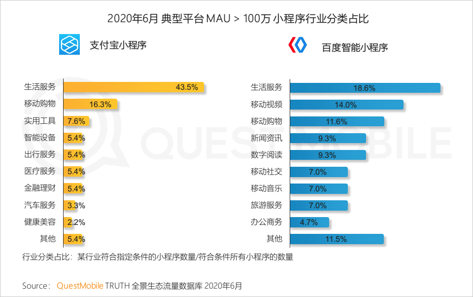 报告显示,小程序的用户增长高于全网,为生活服务、视频类、购物类等应用带来大量用户。以百度智能小程序为例,2020年6月,在 MAU超过100万的行业分类中,生活服务占比为18.6%,其次是移动视频占比14%,移动购物占比11.6%。
