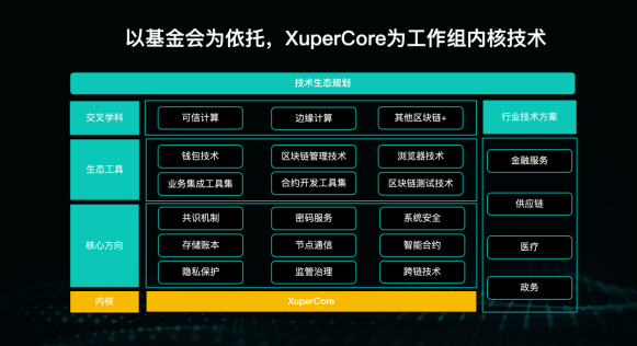 具体而言,在开放易用方面,允许任何单位或个人加入共同开发。具备非常完善易用的工具链、文档和 7x24 小时的社区技术支持;在动态内核方面,业内先进的多区块链执行引擎、核心组件可灵活插拔的动态内核架构,允许任何单位定制个性化区块链内核,从而具备极广的适用性;在高可扩展性方面,采用分层架构,划分子领域,定义领域扩展规范,同时首创实现内核流程和核心组件皆可无代码侵入扩展,从而具备极高的可扩展性;此外,XuperCore 拥有完备的自主研发区块链核心组件,可支持开源社区、开放网络、商业伙伴多领域标杆应用落地,实现生态繁荣。