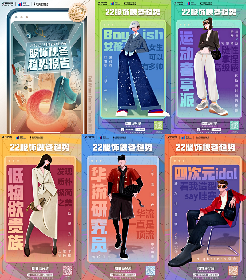 7 月 4 日,由中国服装协会、中国服装设计师协会指导,抖音电商服饰行业、算数电商研究院与中国国际时装周组委会联合制作的《2022 抖音电商服饰秋冬趋势报告》重磅发布。报告显示,2022 年适配抖音平台用户需求的秋冬五大趋势,分别是 Boyish 女孩、运动奢享派、低物欲贵族、华流研究员、四次元 idol。在给予用户更多潮流生活方式新可能的同时,抖音电商向商家、创作者们提供了趋势挖掘的数据解决方案,结合服饰营销规划,在抖 in 新风潮 IP 下聚焦趋势+种草,专项打造【趋势种草机】活动,帮助服饰商家达成营销与销售一体化,实现品销协同增长。
