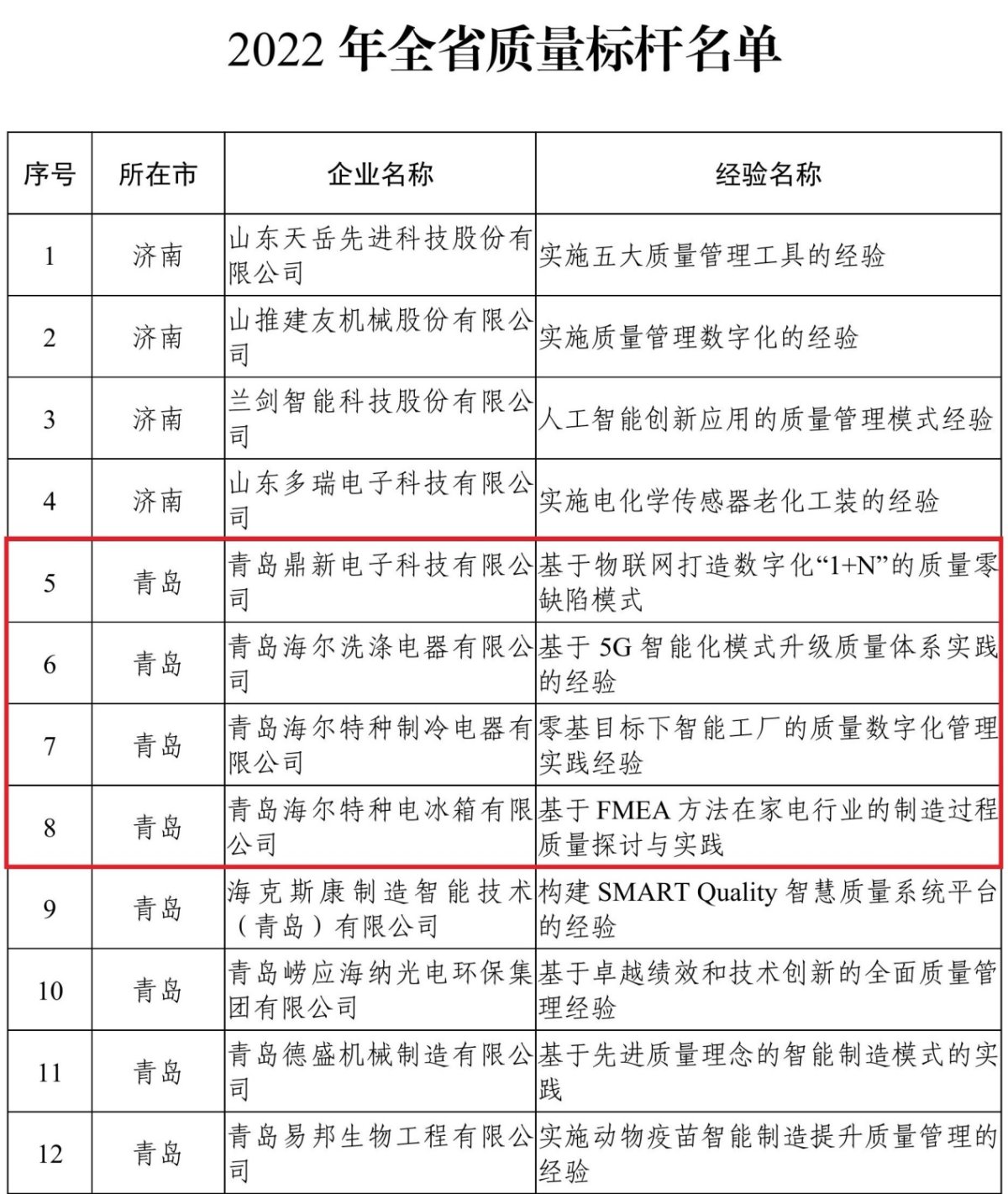 海尔集团 4 家企业入选 2022 年山东省质量标杆。