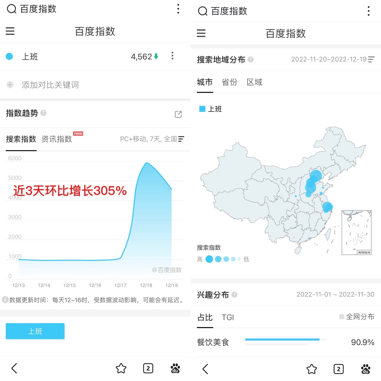 北京部分企业按下复工复产「加速键」,有序开展生产经营活动。根据百度指数显示,近 3 天,「上班」一词搜索指数直线攀升,搜索热度同比增长 305%,北京、河北等地关注度较高。