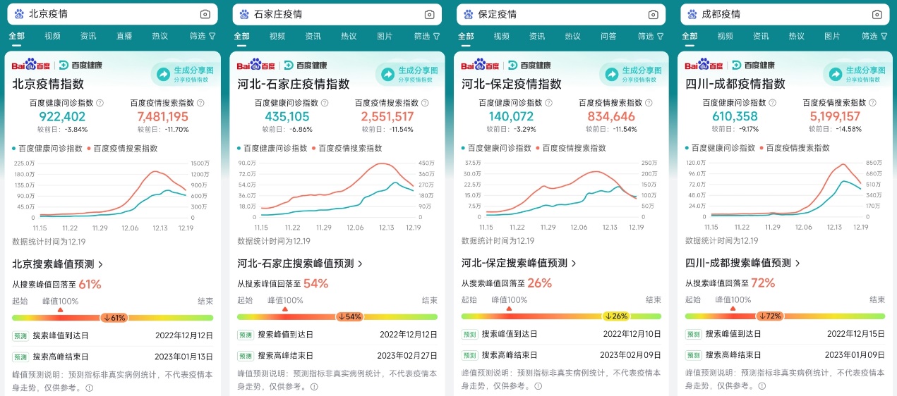 根据百度 APP 上线的「全国各城市疫情搜索高峰进度」最新数据显示,截止到 12 月 20 日,北京市疫情搜索峰值进度回落至 61%,北京感染高峰期已经过去。除此之外,石家庄、保定、邯郸、成都等城市疫情搜索峰值均已进入回落阶段。