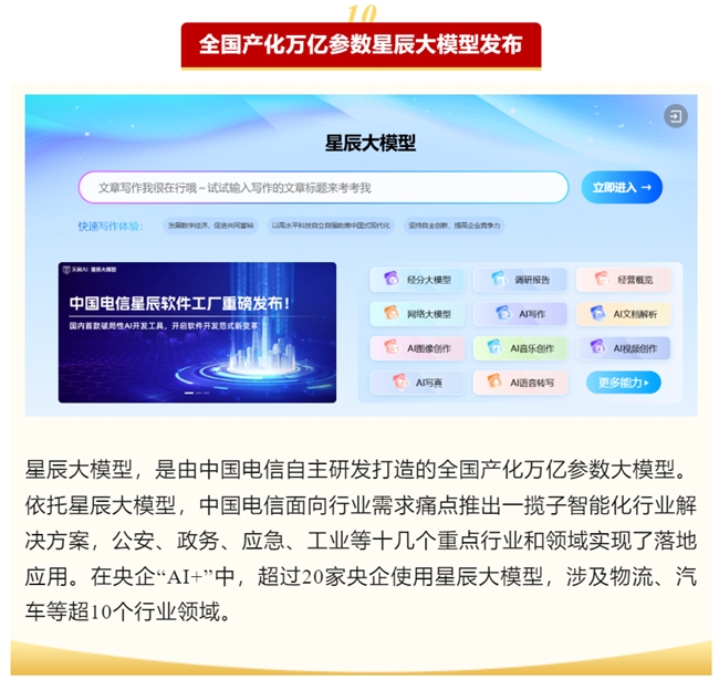 星辰大模型全尺寸全国产的完成, 展示了中国电信在 AI 领域的技术实力和领先优势, 标志着国产 AI 技术发展迈向了新高度, 为各行业数字化转型提供了强大的支撑。