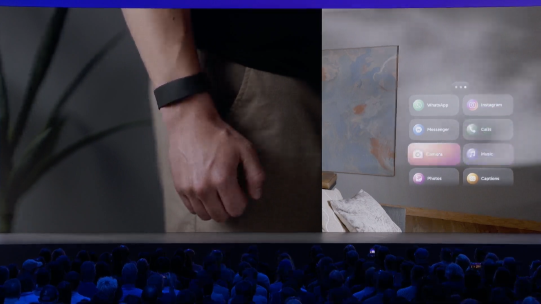扎克伯克还现场演示了使用腕带来实现手势打字输入:从现场的体验来看,其实现效果更接近 Apple Vision Pro 上的那种虚拟键盘输入方式,但两者实现的逻辑完全不同。每分钟能实现 30 个英文单词的输入速度。