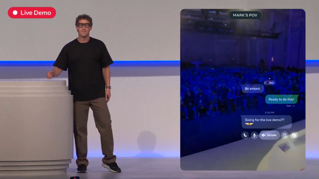 在发布会上,首先就是小扎带着带有显示功能的 Meta Ray-Ban Display 充当提词器上台演示;这个套路今年 Google 也用过一次,目的都是为了展示带有显示功能的 AR 眼镜在第一人称视角内容的消费/生产时的便捷性。