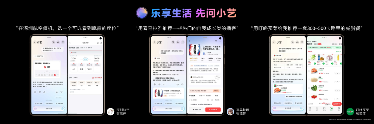 这一突破的核心在于小艺智能体的全面进化。基于 A2A(Agent to Agent)协议架构,小艺不再是传统意义上的 AI 助手,而是化身为一个能调度整个智能体生态的「指挥官」。在实际体验中,用户只需说出「帮我值机选个靠窗座位并预订接机专车」,小艺便能自动调度航旅类智能体完成值机选座,同时协同出行类智能体安排接机服务。不仅如此,截至目前,小艺的「朋友圈」也已相当丰富——从「买菜」到「炒股」,从「订票」到「听书」,只需一句简单的指令,小艺就能无缝调起叮咚买菜、东方财富、深圳航空、喜马拉雅等众多应用的智能体,真正实现了「说一句话,办多件事」的智能交互体验,诠释「越展开越心动」的用机体验。