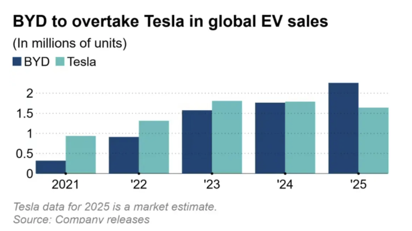 日经:比亚迪 2025 年电动车销量将首超特斯拉,成全球第一