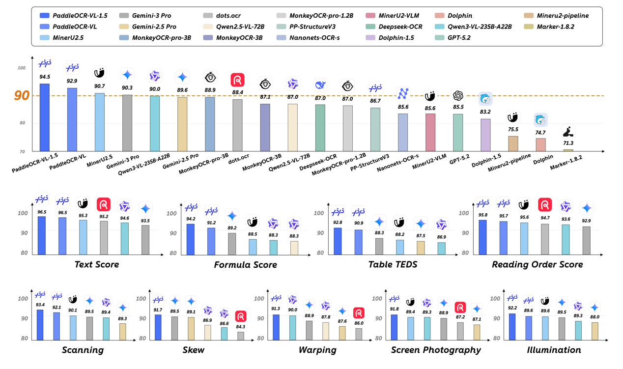 1月29日,百度正式发布并开源新一代文档解析模型PaddleOCR-VL-1.5。该模型以仅0.9B参数的轻量架构,在全球权威文档解析评测榜单OmniDocBench V1.5中取得全球综合性能第一成绩,整体精度达到94.5%,超过Gemini-3-Pro、DeepSeek-OCR2、Qwen3-VL-235B-A22B、GPT-5.2等模型。