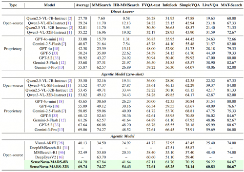 在 MMSearch、HR-MMSearch、FVQA、InfoSeek、SimpleVQA、LiveVQA 等基准测试中,SenseNova-MARS 取得开源模型中的 SOTA 成绩,还超越 Gemini-3.0-Pro、GPT-5.2 等顶级闭源模型,在搜索推理和视觉理解两大核心领域全面领跑。更多细节请参见技术报告(https://arxiv.org/abs/2512.24330),欢迎开发者、各行业用户测试与体验。