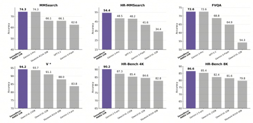 在 MMSearch 榜单(图文搜索核心评测)中,模型以 74.27 分登顶,超 GPT-5.2(66.08 分);HR-MMSearch(高清细节搜索评测)中以 54.43 分领先,显著拉开与闭源模型的差距。
