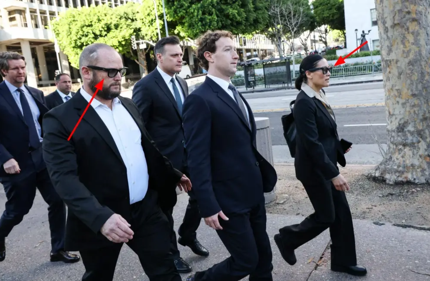 扎克伯格本人身着深蓝色西装、系着领带,到场时并未佩戴眼镜。在他走向法院大楼途中,身旁两侧分别是长期担任其执行助理的安德里亚 · 贝斯梅恩,以及一名戴着 Meta 雷朋智能眼镜的身份不明男子。