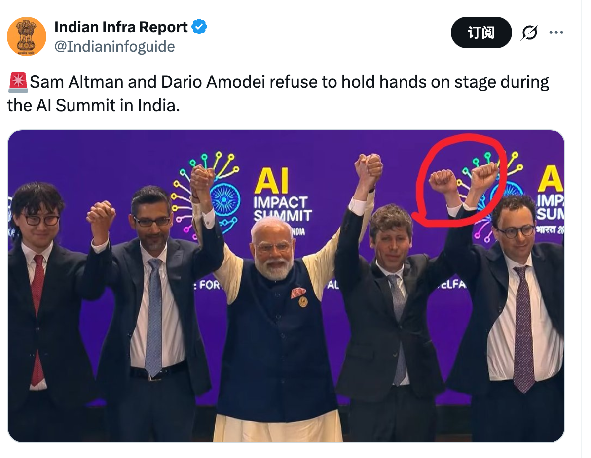 在印度 AI 影响力峰会的舞台上,德米斯 · 哈萨比斯(DeepMind CEO)、孙达尔 · 皮柴(谷歌 CEO,或译「桑达尔 · 皮查伊」)、布拉德 · 史密斯(微软总裁)、Sam Altman(OpenAI CEO)、达里奥 · 阿莫代伊(Anthropic CEO)等高管与印度总理纳伦德拉 · 莫迪并肩而立。