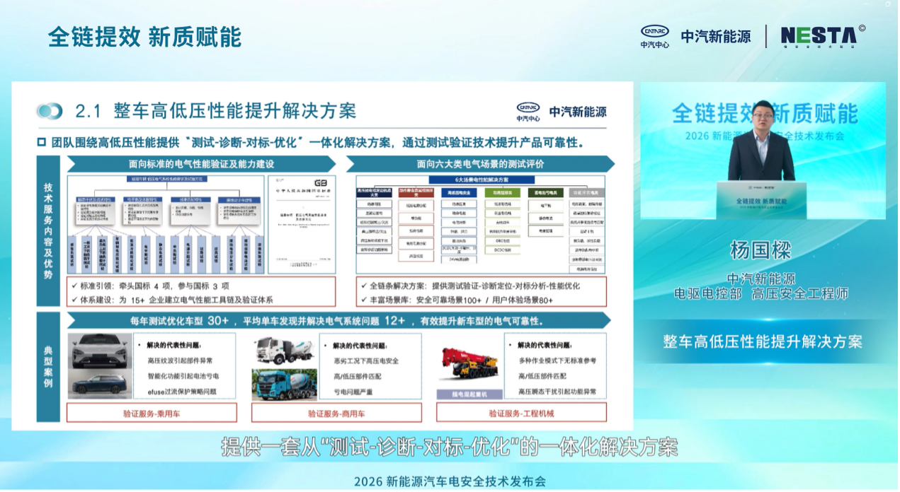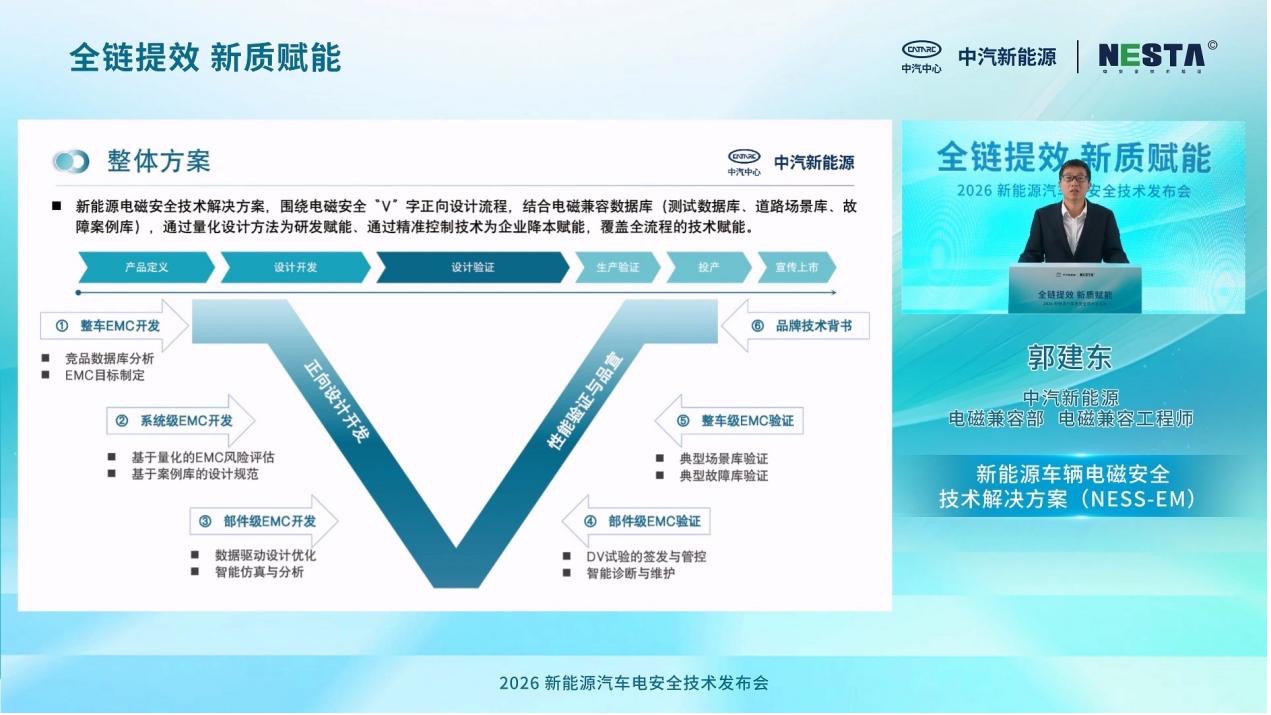 4 月 22 日,中汽研新能源汽车检验中心(天津)有限公司(以下简称「中汽新能源」)举办了一场名为"全链提效、新质赋能"的电安全技术发布会,正式推出了新能源汽车电安全解决方案——NESS(New Energy vehicle electrical Safety Solution)。