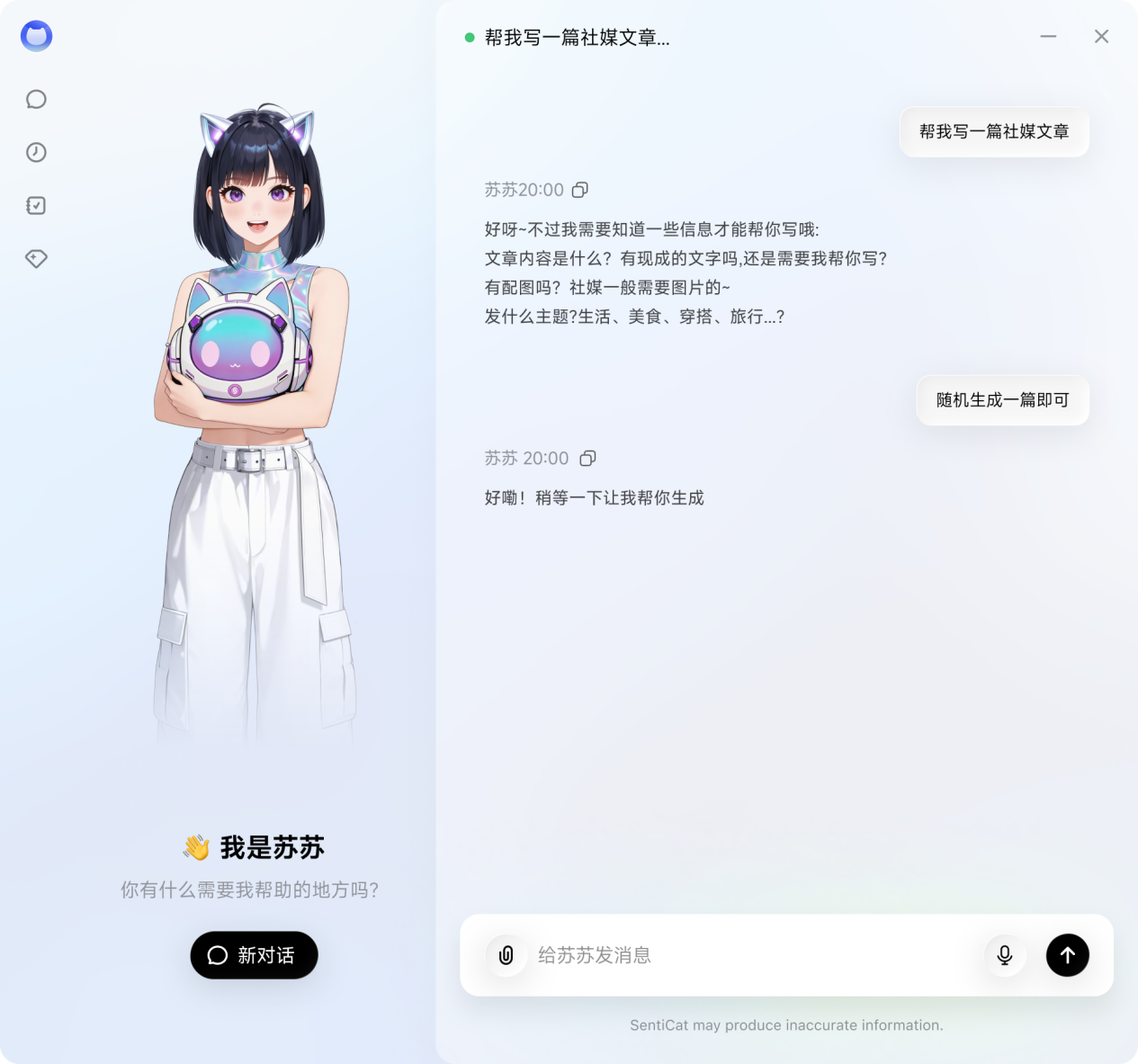 SUSU 以 Live2D 的生动形象运行在系统中,她拥有长期记忆和自我成长能力,会用表情包和颜文字与用户交流,甚至会“犯困”。她存在的意义在于记住用户的喜好、习惯和每一次闲聊,通过高频的日常互动,演化出独一无二的专属性格,与用户建立深刻的情感联结。而 AI 小猫 SentiCat,则是 SUSU 派来“干活”的得力助手,它负责调用工具、联网搜索、数据分析等一系列复杂任务,覆盖日常办公、深度研究与开发编程等多类场景。