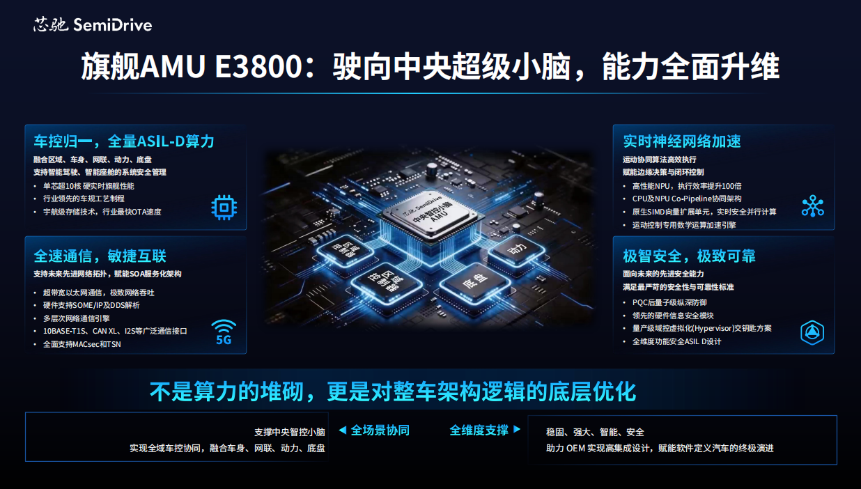 芯驰为中央小脑这一复杂系统,打造了“AMU(Architecture Master Unit)”超级算力基座。AMU超越了传统的普通MCU芯片,是一个具备超高集成度、更强大并且安全的实时算力平台。在芯片的基础上,融合了芯驰的深度系统优化能力和领先的软件能力,向车企交付软硬协同的解决方案。