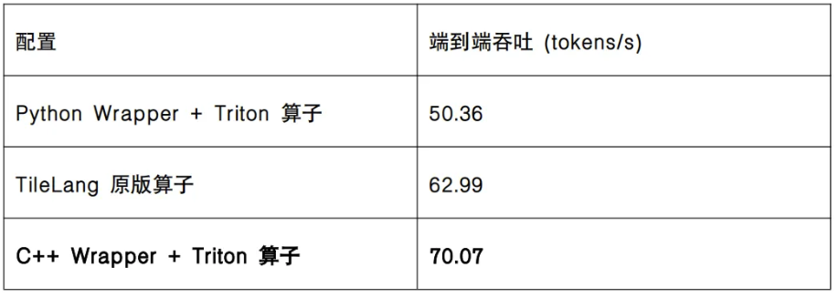 C++ Wrapper技术是FlagOS技术社区专门为提升基于Triton语言的算子内核调用效率而打造的技术。目前已经支持了该技术的芯片包括华为昇腾、寒武纪、摩尔线程、平头哥真武、及英伟达等。使用了C++ Wrapper技术,在普通的Transformers框架下,可以显著提升使用了Triton算子的模型的端到端效率,实现跨芯普适、和高效推理的双重目标。通过端到端效果评测(NV H20,DeepSeek-V4-Flash FP8),C++ Wrapper + Triton 比 TileLang 快11%,比 Python Wrapper 版快 39%。