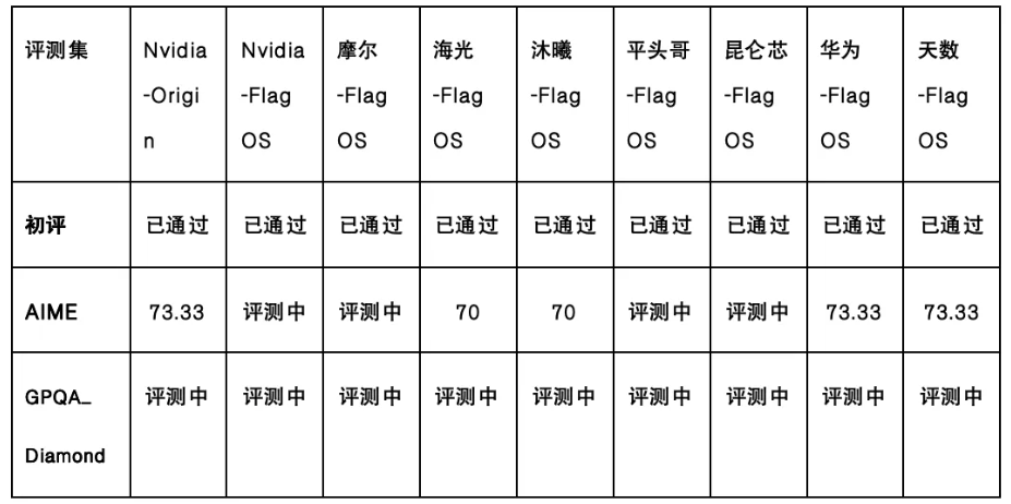 注:本测试结果仅用于对迁移前(Nvidia-Origin)和迁移后(-FlagOS)版本的互相对齐验证,并不代表 DeepSeek 模型的官方性能,DeepSeek 模型的官方性能以 DeepSeek 官方公布数据为准。