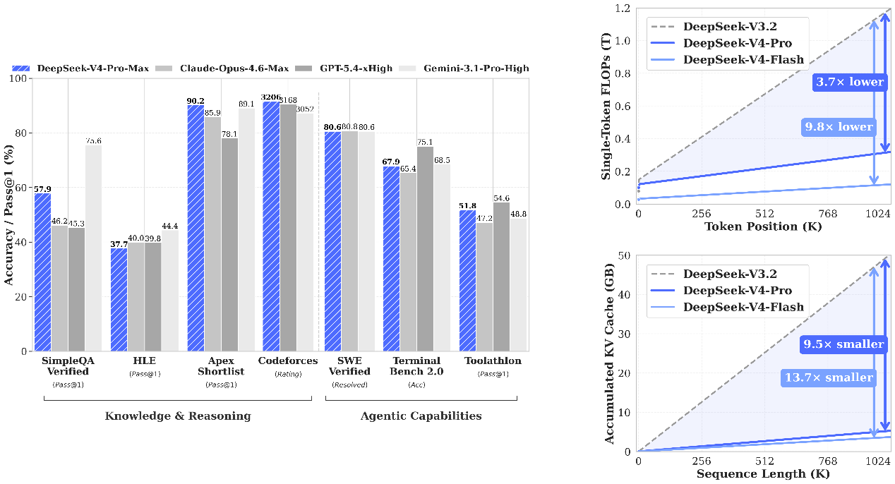 首先完成在八款芯片适配的DeepSeek-V4-Flash 是深度求索推出的 V4 系列两大模型之一,采用混合专家(MoE)架构,总参数量 284B,激活参数仅 13B,支持 100 万 token上下文长度。该模型在架构上引入了混合注意力机制(结合压缩稀疏注意力CSA与高度压缩注意力HCA,大幅提升长上下文效率)、流形约束超连接(mHC,增强跨层 信号传播稳定性)以及 Muon优化器(加速收敛、提升训练稳定性)。预训练数据超过32Ttoken,后训练采用两阶段范式——先通过 SFT和GRPO强化学习独立培养领域专家,再通过在线策略蒸馏将多领域能力统一整合到单一模型中。在最大推理力度模式(Flash-Max)下,给予更大思考预算使其推理能力可接近Pro版本水平;受限于参数规模,在纯知识类任务和最复杂的Agent工作流上略逊于 Pro。 整体性能参考如下官方评测结果: