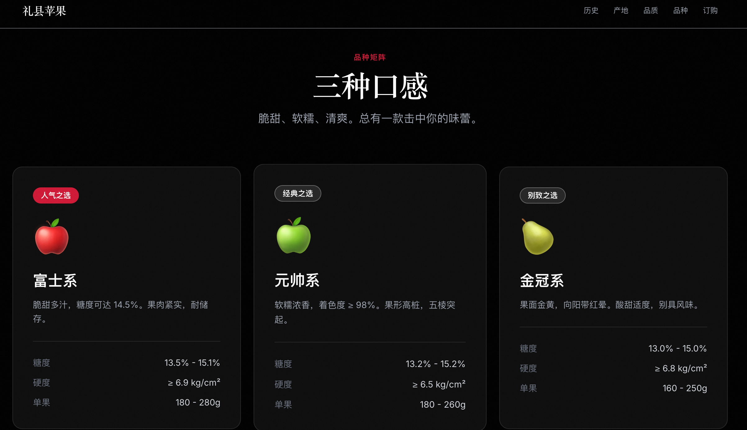 "我给它的提示词非常简单——设计一个甘肃礼县苹果介绍的网页,结合当地悠久的历史。"白亚龙说,"它把 1952 年引进苹果、1973 年外销基地、2008 年奥运果品,时间线全给你画出来了。连广告词都有了——'每一口都是自然的馈赠'。"