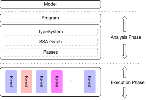 Paddle Lite架构由四层次组成:第一层model 层直接接受Paddle训练的模型,通过模型优化工具转化为NaiveBuffer特殊格式,以便更好地适应移动端的部署场景;第二层Program层是operator序列构成的执行程序;第三层是一个完整的分析模块,主要包括TypeSystem、SSA Graph和Passes等模块;第四层是执行层,由Kernel序列构成的Runtime Program。