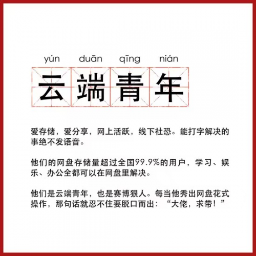 由此可见,“云端青年”一词的出现是偶然也是必然。该热词能够流行的背后,折射出当下人们的个人数据日益丰富、越来越依赖诸如百度网盘等互联网产品完成学习、办公和娱乐的生活方式。
