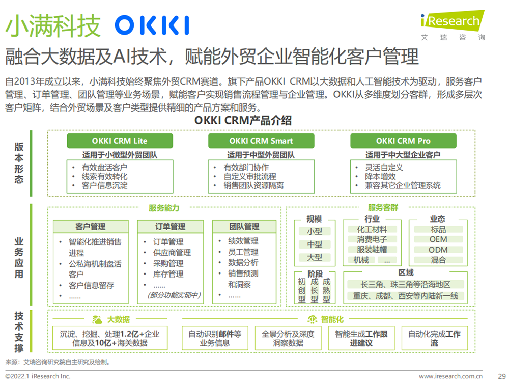 日前,艾瑞咨询发布了 2022 年《中国 CRM 行业研究报告》(以下简称「报告」),行业前沿的出海 SaaS 服务商小满科技入选综合垂直型 CRM 厂商,并作为典型案例展现了产品实力、竞争优势及发展方向。