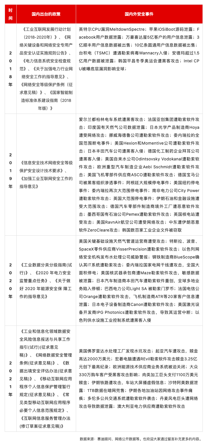 实际上,通过 2018 年-2022 年的安全事件和网络安全领域主要法律法规及政策汇总,不难看出工控安全市场的发展,离不开两大驱动:安全事件驱动,政府政策驱动。