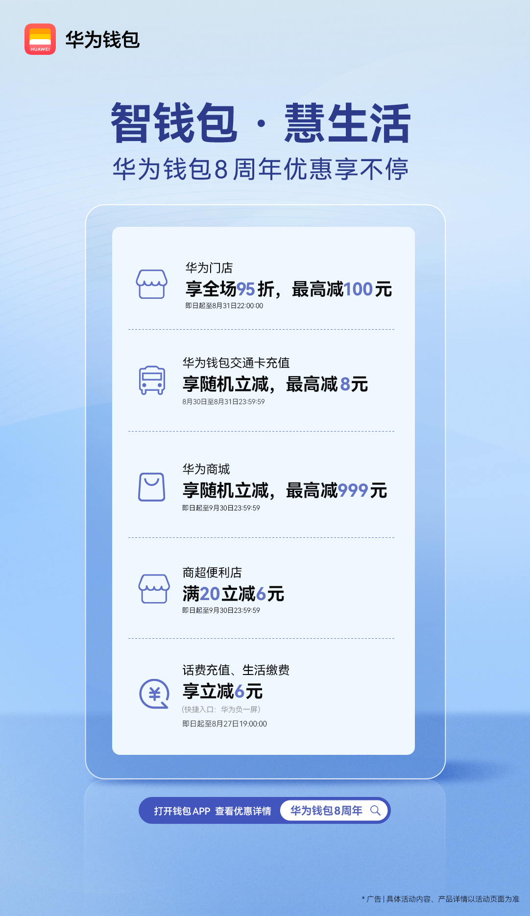 新学期悄然而至,学生们迎来了新的阶段,华为钱包为了让学生们享受更舒服的新学期,不仅给学生们提供了便捷、安全、实惠的支付体验,更在华为钱包 8 周年之际推出了一系列令人惊喜的优惠活动。立刻打开华为钱包 APP,轻松管理校园卡、银行卡、交通卡等多种卡证票券,更好地享受一键支付的便捷与乐趣。