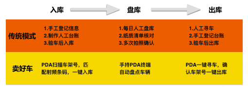 为了优化仓储管理,卖好车新的仓储管理系统还新增了“智能盘库”、“一键寻车”等功能。面对仓库成百上千台汽车,库管人员可以通过移动终端(PDA)在任何时间对在库车辆进行精准盘查和校验。在流程管理上,车辆一经售出处于待运输状态,所在仓储库同步收到最新交易讯息,库管可通过“一键寻车”快速锁定待出库车辆,启动出库运输流程。