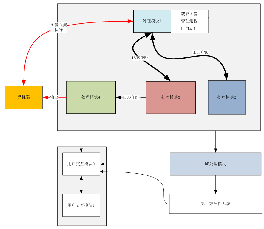 处理模块1:负责和手机交互,UI自动化操作,管理,结果记录和存储等;