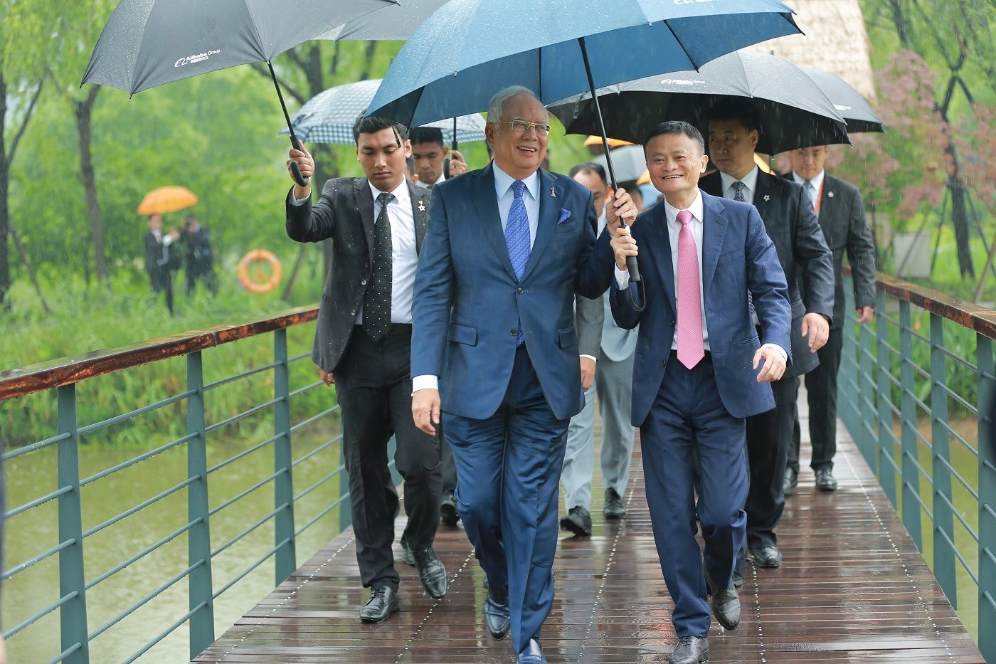 兴奋之余,纳吉布表达的是两人之间的友情。今年 5 月,纳吉布到访杭州阿里巴巴总部,和马云同坐一个沙发,一同竖起大拇指为合作点赞。到访时刚好下雨,两人还同撑一把伞。