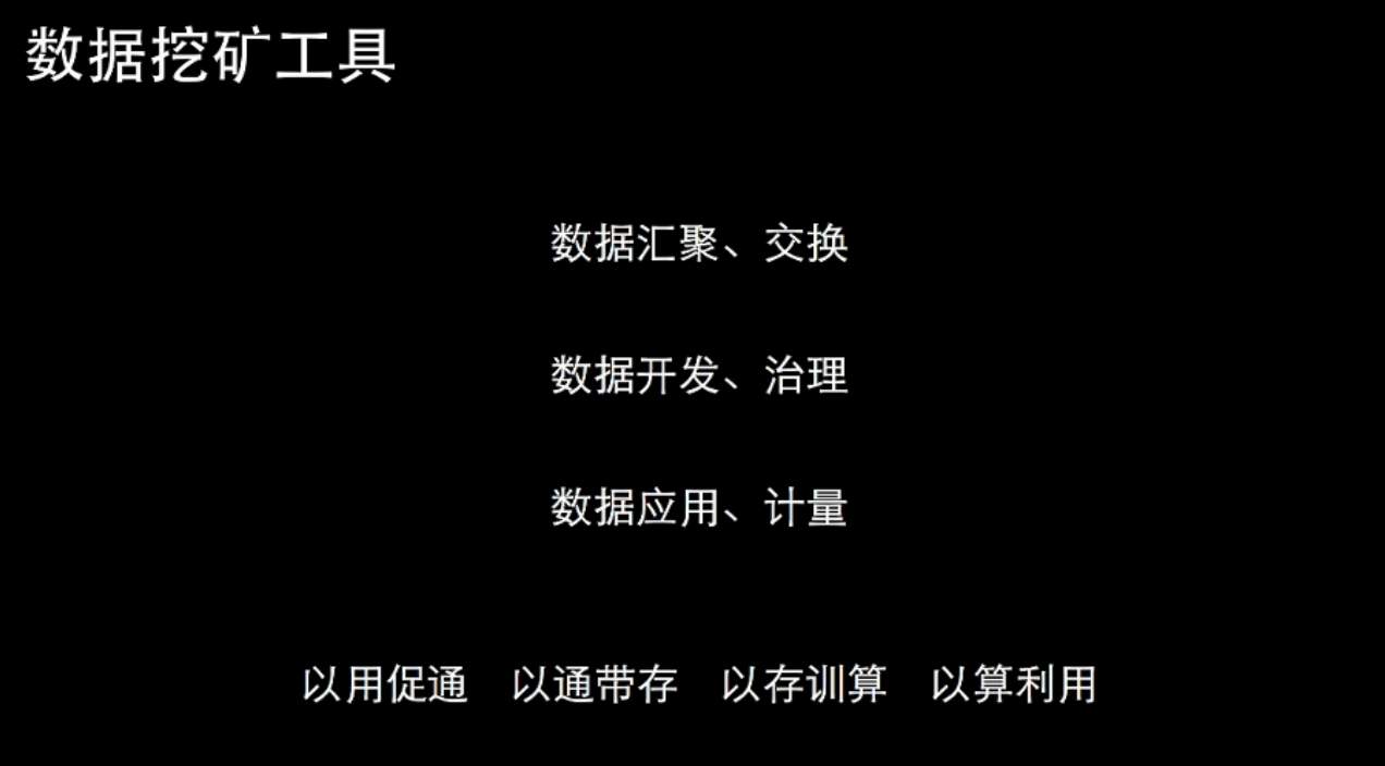 整个数据挖矿过程浓缩成三个字,就是存、通、用,即把数据存储汇聚后,把数据进行连接打通, 然后结合业务场景把数据用起来。把它扩展成 16 个字方略就是:以用促通,以通带存,以存训算,以算利用。对应到工具,就是要解决数据汇聚、交换、开发、治理、应用、计量等问题。