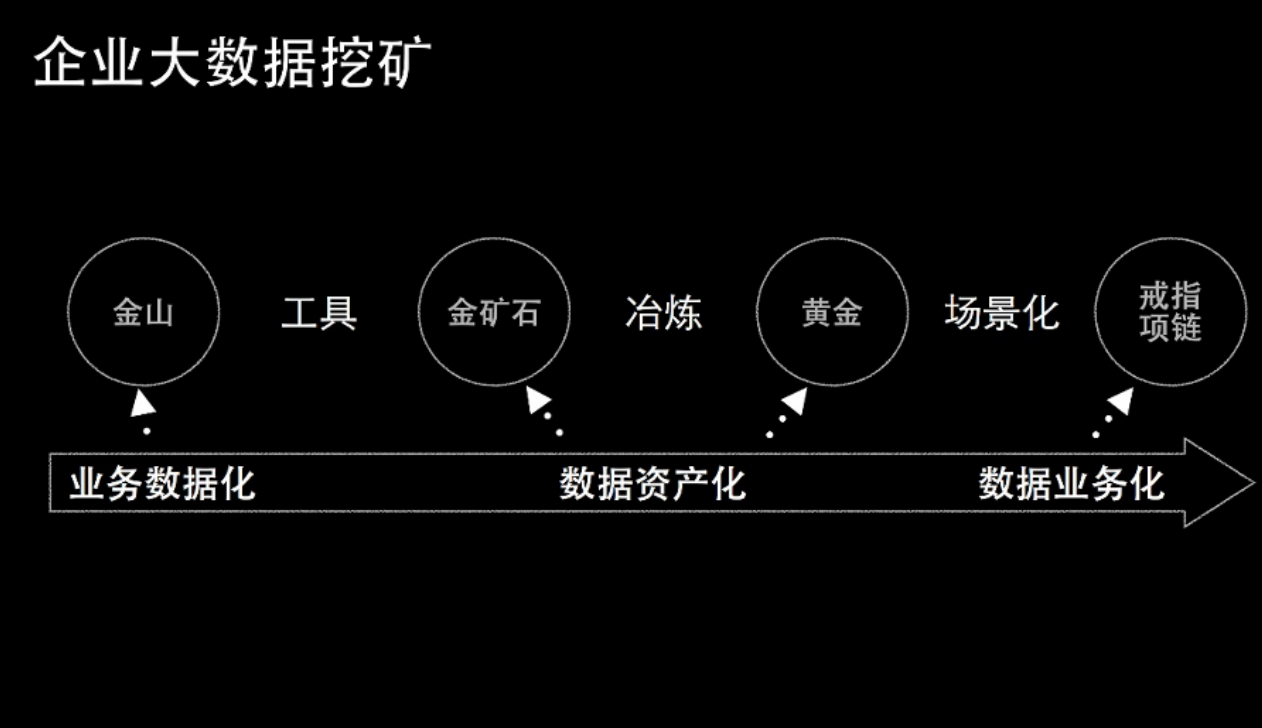 前面说的问题是所有行业客户的困惑,我们希望把这么多年积累沉淀的大数据能力输出到各个行业,帮企业挖掘数据价值。我们把挖矿过程拆分为几个环节: