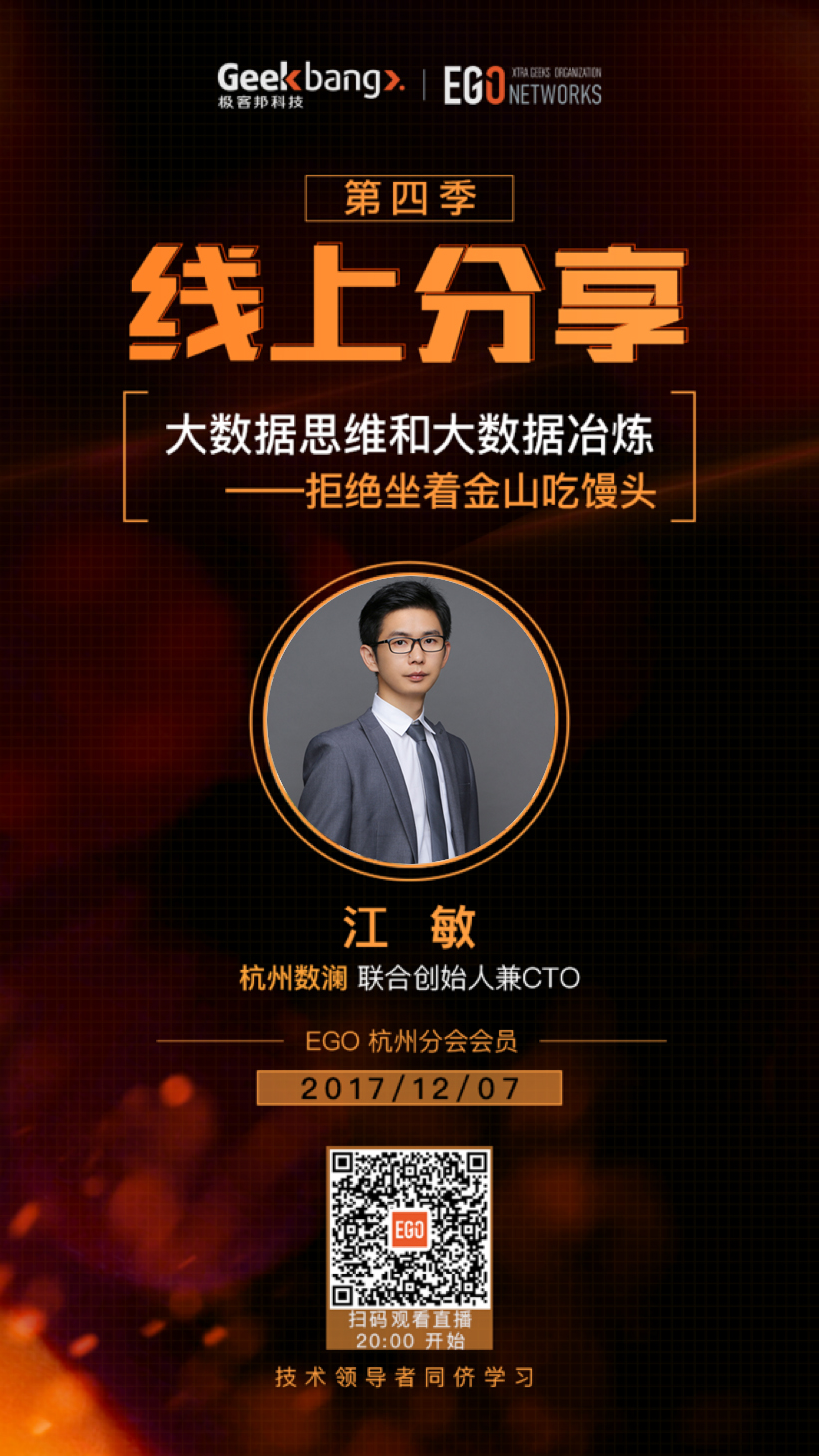 12 月 7 日,数澜联合创始人 & CTO 江敏作为 EGO 线上分享第四季的嘉宾,与大家交流了大数据思维和大数据冶炼的经验心得。