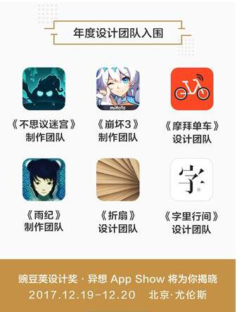 除了年度入围应用和年度入围游戏,豌豆荚年度设计奖还特别设置了年度设计团队奖项,精选 6 个以匠人之心打造好产品的团队入围,分别是 『不思议迷宫』制作团队、『崩坏 3』制作团队、『雨纪』制作团队、『摩拜单车』设计团队、『折扇』设计团队、『字里行间』设计团队。