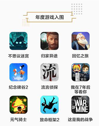 入围年度游戏的 9 款游戏分别是『不思议迷宫』、『归家异途』、『回忆之旅』、『纪念碑谷 2』、『流言侦探』、『我在 7 年后等着你』、『元气骑士』、『致命框架 2』以及『这是我的战争』。精选的 9 款入围游戏,都在画面、玩法、立意等方面有突出表现,可以说是 2017 年精品游戏的趋势代表。