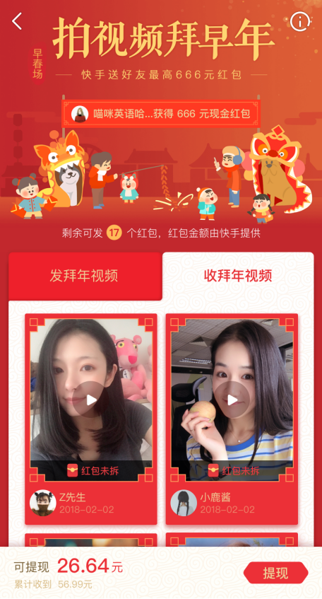 过去一年,快手发展迅猛,《南方周末》甚至以「现象级成长」来评价快手,「666」正是从快手流行开来的词语。而本次 6.66 亿的金额,也让快手一举成为短视频领域金额最大的春节现金红包发放平台,同样具有开创意义。