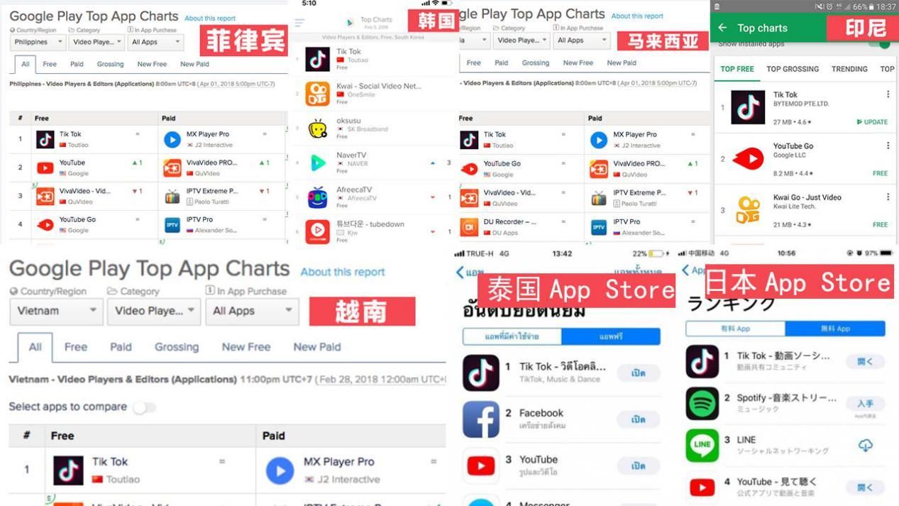 1 月,Tik Tok 在泰国 App Store 登顶。2 月,Tik Tok 在越南登上 Google Play 视频排行榜第一。此后,抖音在东南亚高歌猛进,先后在菲律宾、印度尼西亚、马来西亚等多个国家登上视频类排行榜第一。