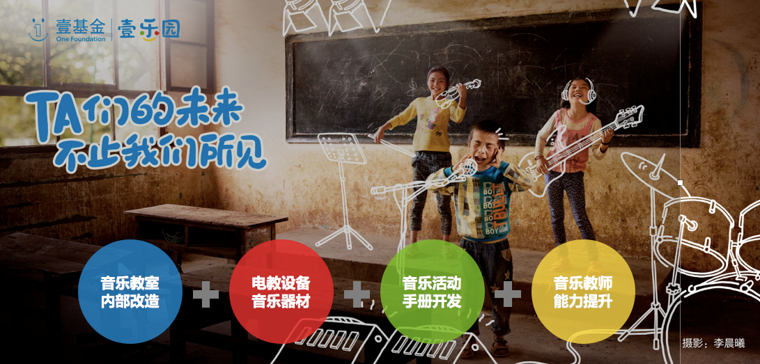 「壹乐园音乐教室」是由壹基金发起,旨在以儿童为本,以儿童参与为中心,通过快乐游戏的方式,促进有效音乐教育。项目自 2014 年启动,截止 2017 年底已在中西部及灾害多发地 14 个省份共建设 375 间音乐教室,培训 439 名乡村音乐教师,近 24 万名乡村儿童受益。
