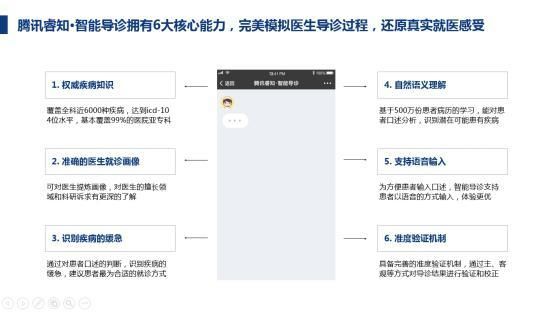 腾讯睿知针对诊前需求,率先落地智能导诊,以妇幼疾病领域为突破口,目前已覆盖 500 多种妇幼领域的常见疾病。广州妇女儿童医疗中心已经试运行智能导诊功能 3 个多月,疾病判断准确率 94%,医生推荐准确率 96% 以上。此外在全科领域,腾讯睿知仍在不断拓展,覆盖疾病范围已扩大至 23 个学科,3000 多种病种。