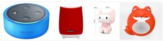 (自左向右分别为:Echo Dot,晓雅 Mini、天猫精灵儿童智能音箱、TicKasa Fox)