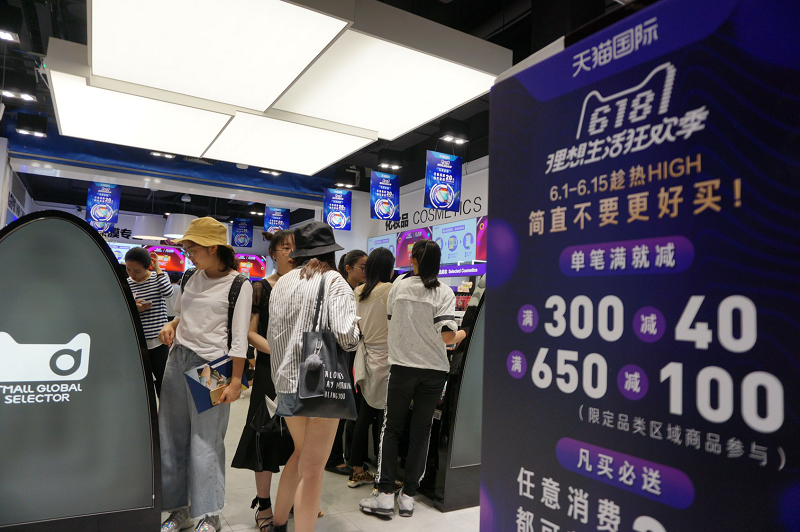 6 月 2 日,杭州西湖银泰的天猫国际线下门店,已经成为杭州人民在家门口就能逛的「免税店」。上周末,该店已经提前进入天猫 618 节奏,店内挤满了前来体验的消费者。